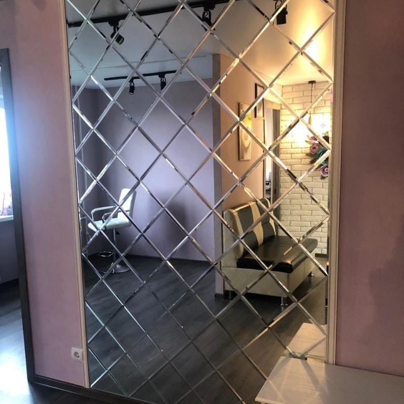 -Зеркальное панно в салоне, Москва, серебряная глянцевая плитка квадратной формы